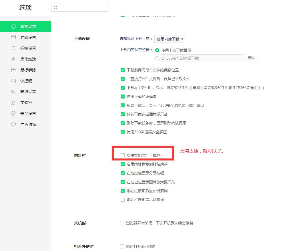 2、點開設(shè)置默認(rèn)是基本設(shè)置,然后拉到底,找到“啟用智能網(wǎng)址"這個選項,把勾去掉,就可以了。