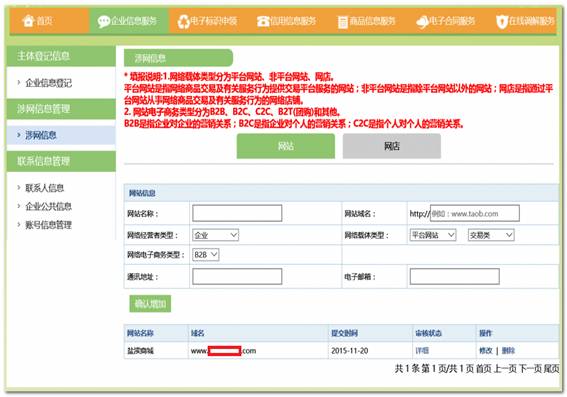 企業(yè)主體可對(duì)其開(kāi)辦的網(wǎng)店或網(wǎng)站進(jìn)行管理涉網(wǎng)信息登記,如下所示: