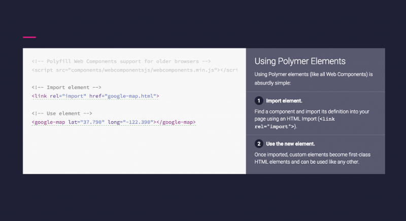 谷歌材料設(shè)計(jì)打響了第一炮,它在所有新式瀏覽器的支持下,提供了來(lái)自于Android app的多種多樣的動(dòng)畫(huà)和互動(dòng)組件,以及像這樣的簡(jiǎn)單標(biāo)簽: